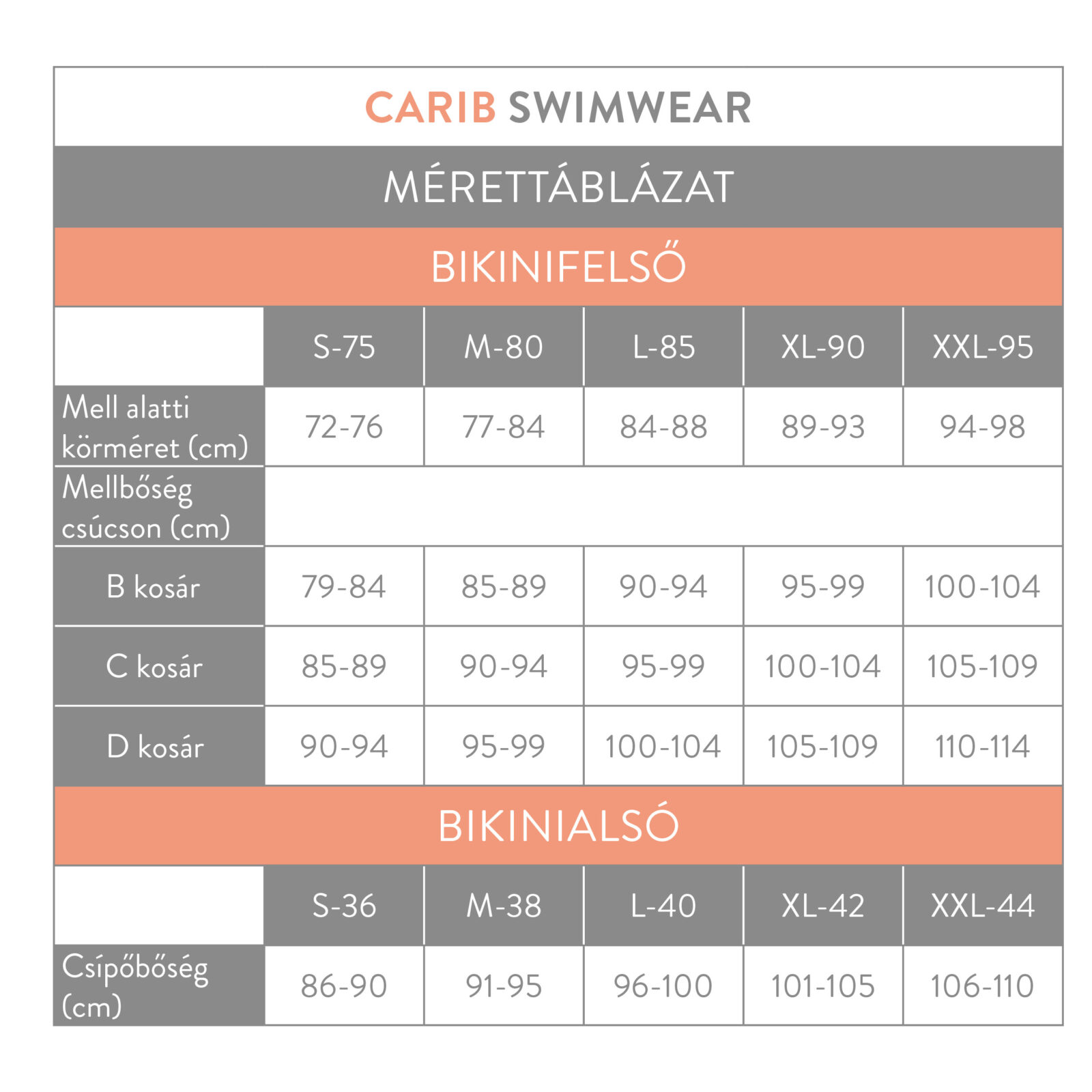 • Mérettáblázat
