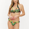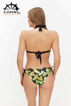 C kosaras, push-up, elöl szabályozható, oldalt és alul megerősített háromszög bikinifelső, nyakban és hátul kötős. A két kosár közötti fűző szexi megjelenést kölcsönöz, és a kosarak közötti távolság szabályozhatóságát biztosítja. Oldalt kötős, hátul húzott, csípő szabású bikinialsó.