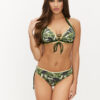 C kosaras, push-up, elöl szabályozható, oldalt és alul megerősített háromszög bikinifelső, nyakban és hátul kötős. A két kosár közötti fűző szexi megjelenést kölcsönöz, és a kosarak közötti távolság szabályozhatóságát biztosítja. Oldalt kötős, hátul húzott, csípő szabású bikinialsó.