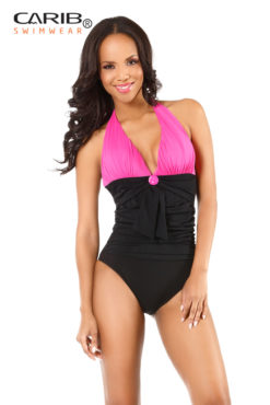 Egyrészes, ráncolt, nyakbakötős fürdőruha, kivehető puha szivaccsal. Mellközépen kellékkel és masnival díszítve.