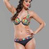 Kosaras bikini felső állítható vállpánttal és hátul kötős oldalpánttal. Övvel és fémkellékkel díszített bikini alsó.